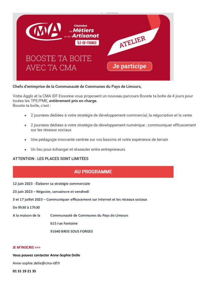 Formation « Booste ta Boîte » – CCPL Briis / Forge Eric Bourguet CCPL, CMA juin 1, 2023 Cliquez sur le titre ci-dessus pour avoir plus de renseignements